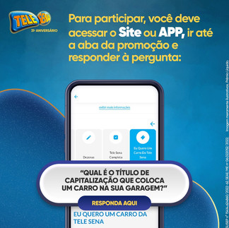 E tem mais! O povo tá amando saber que a promoção regional continua! E nesta edição de Aniversário ficou ainda melhor! Na promoção comercial “Eu quero um carro da Tele Sena” dá pra concorrer, de segunda a sexta-feira, a um automóvel zerinho. Pra participar é muito simples! Se você comprou a Tele Sena física nos Correios, Lotéricas ou qualquer outro ponto de venda, acesse telesena.com.br, por meio de login e senha, cadastre a sua Tele Sena de Aniversário e responda corretamente à pergunta da promoção: QUAL É O TÍTULO DE CAPITALIZAÇÃO QUE COLOCA UM CARRO NA SUA GARAGEM? Caso a sua Tele Sena seja adquirida por meio digital, basta responder corretamente à mesma pergunta para gerar, automaticamente, o seu cupom.
